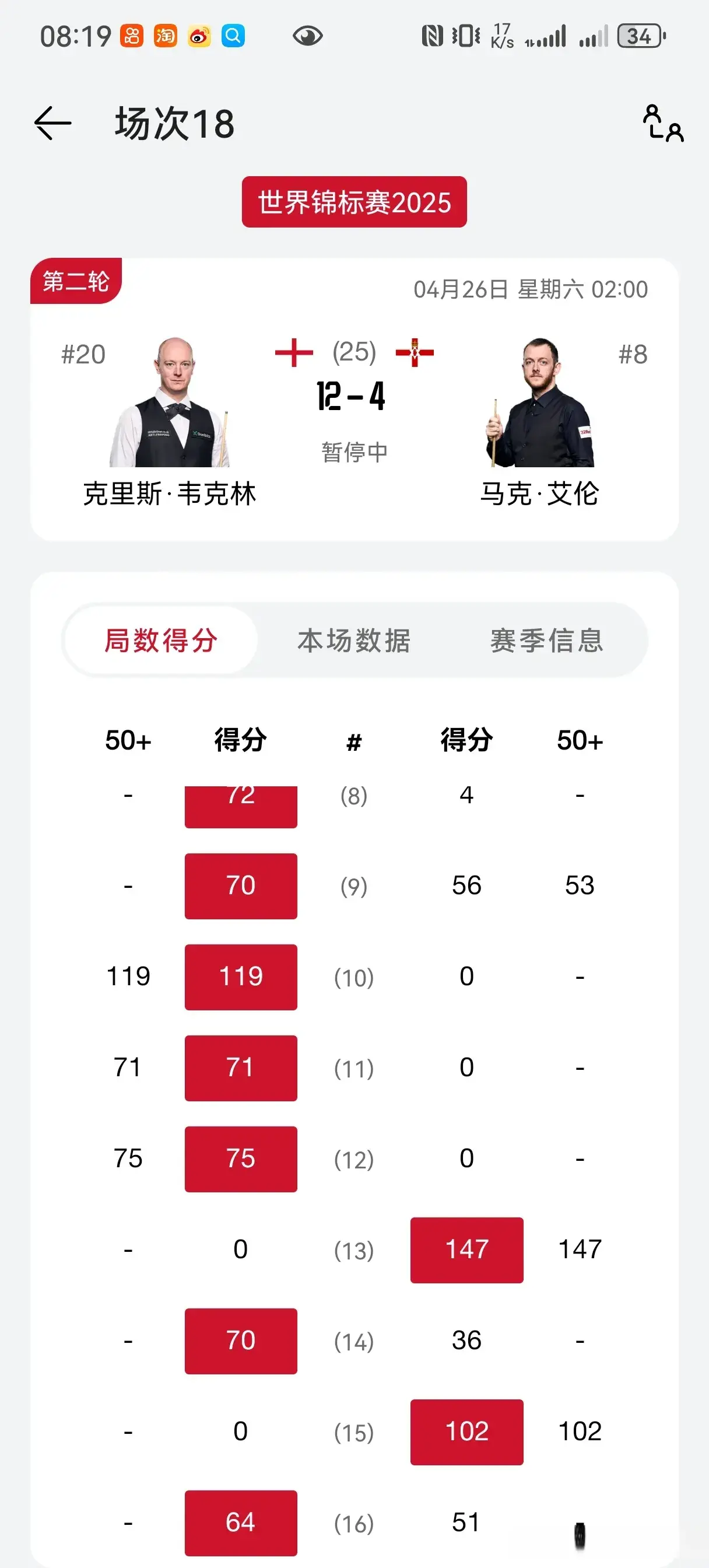 2024到2025赛季的斯诺克作事联赛继续进行在北京时辰的2025年的4月25日斯诺克世锦赛迎来正赛第二轮的对决暨八强争夺战的比赛开战,马艾伦更是有望成为本次世锦赛正赛第二轮第一个出局的球员。而韦克林亦然在第二阶段取得了遥遥普及亦然有望最初晋级。